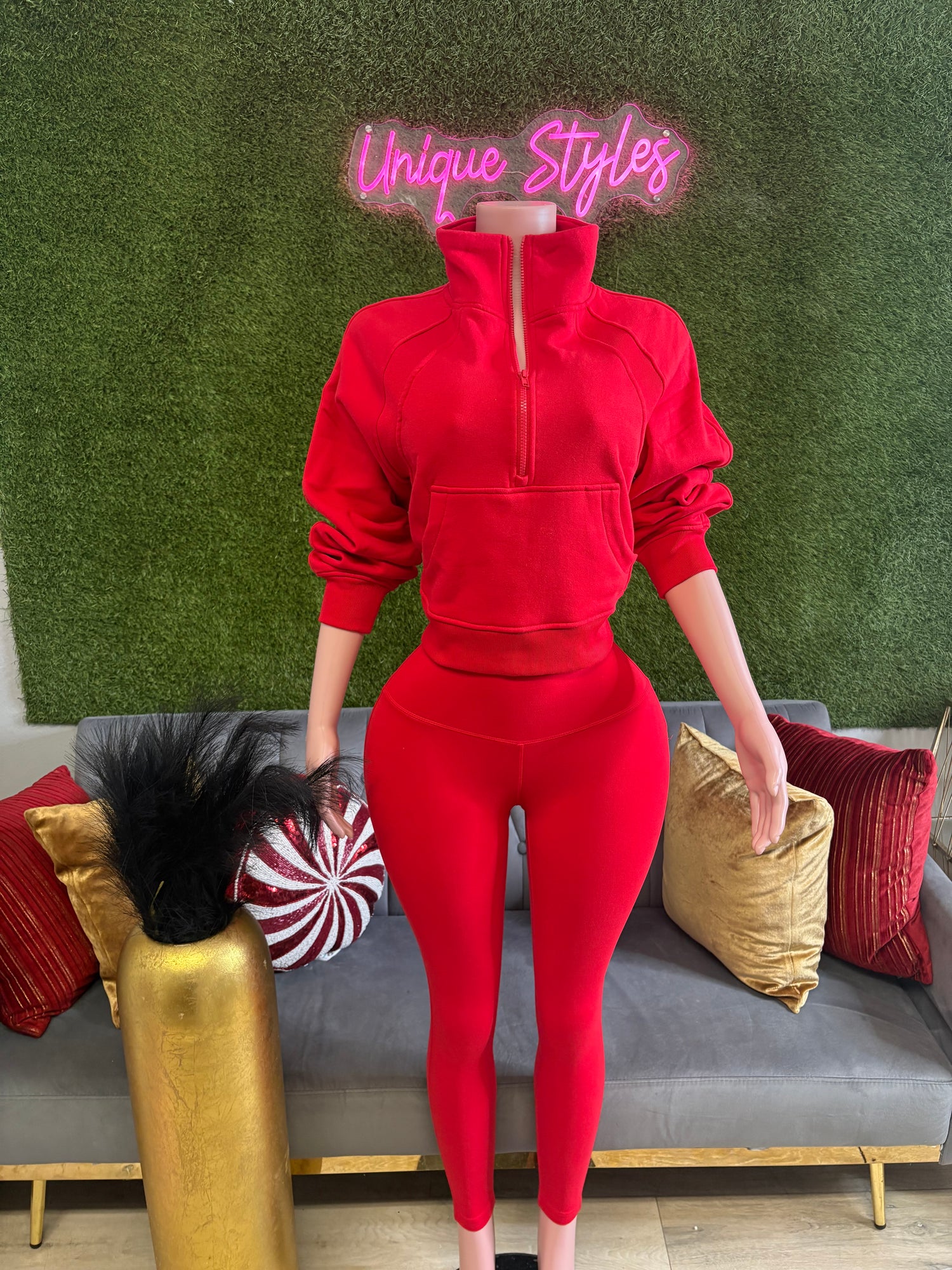 A matching red two-piece set with a zip-up pullover top and high-waisted leggings.