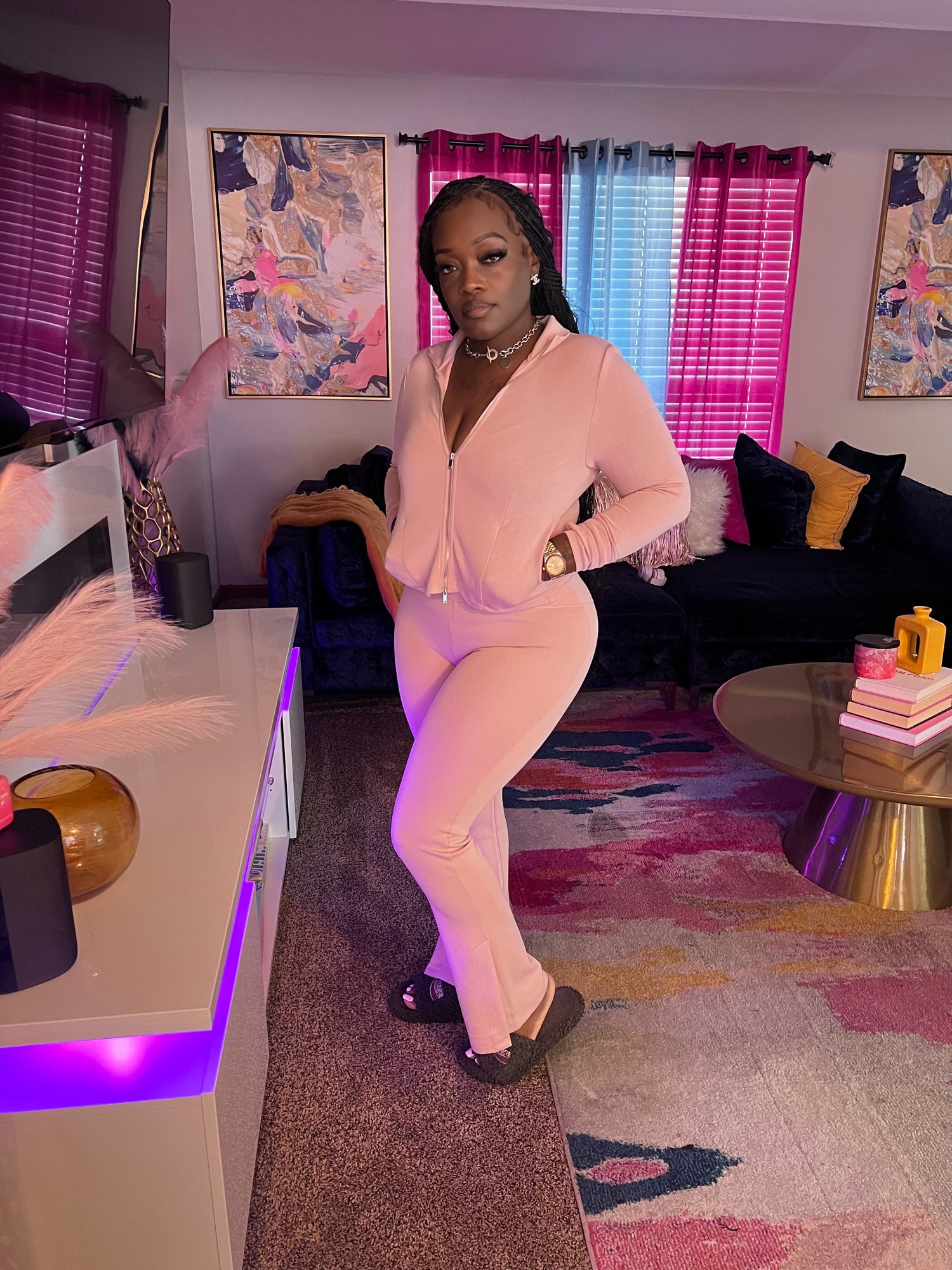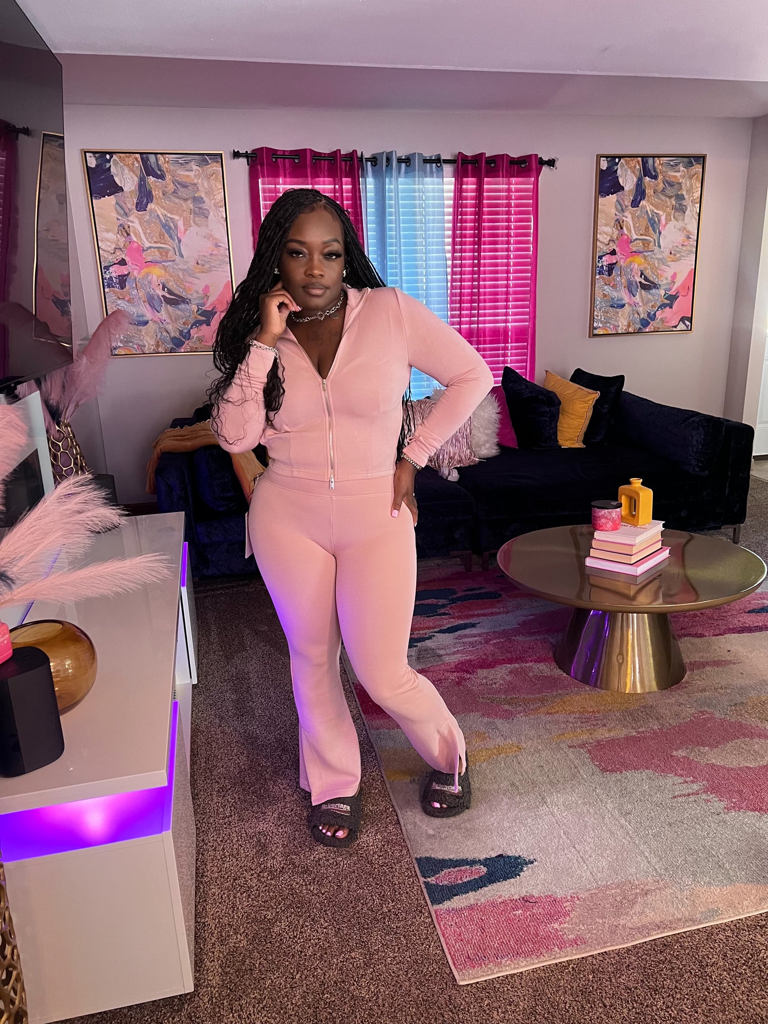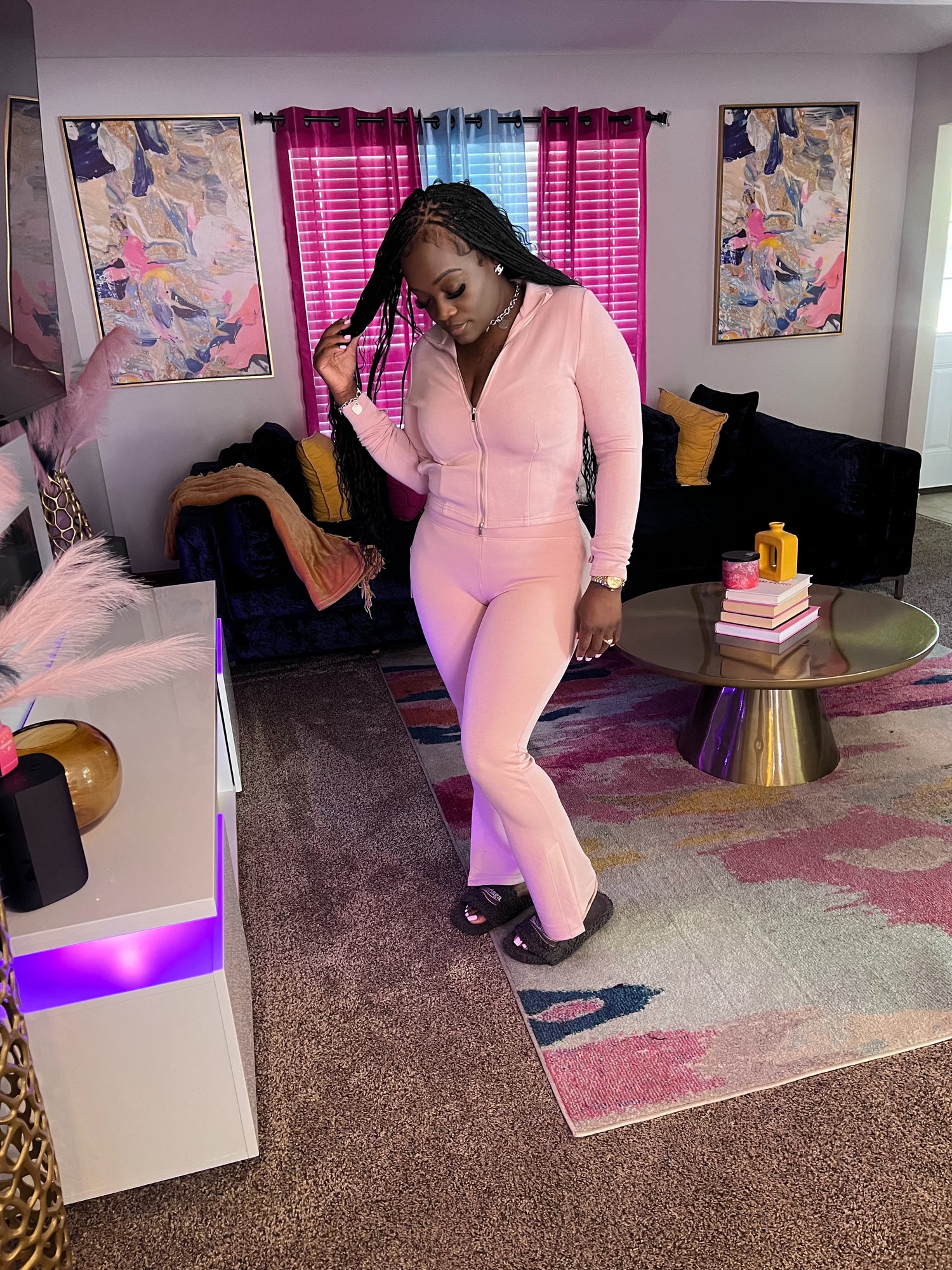 A cozy zip-up hoodie with matching flare pants for a relaxed, casual look.