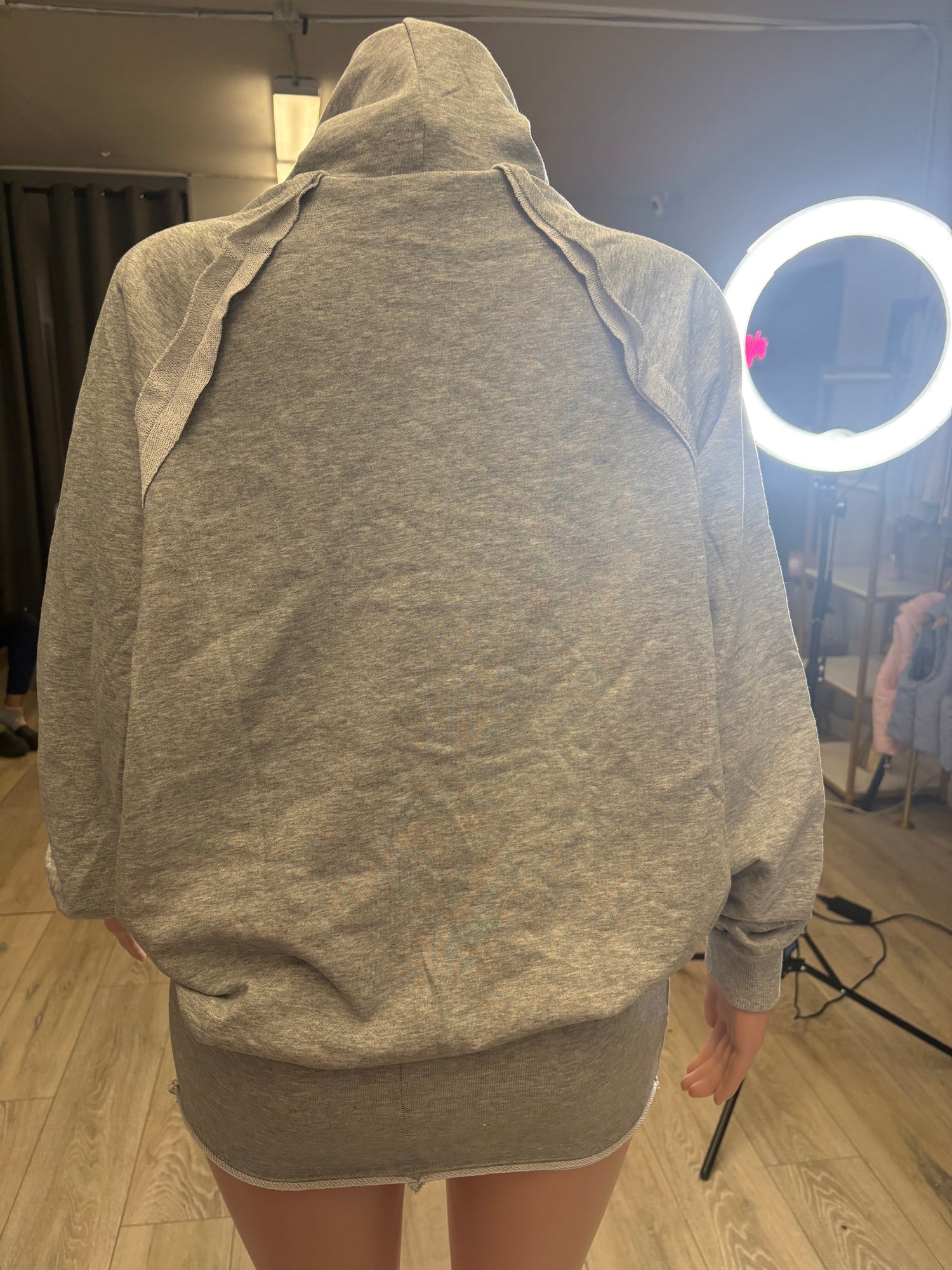 Set is made with cotton. Jacket is oversized and skirt runs true to size with a stretch.
